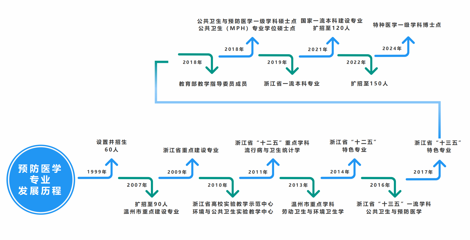 自建校伊始就开始培养公共卫生与预防医学人才,并于1999年专门设立预防医学专业,是浙江省属高校中最早开始招收本专业学生的学校。本专业自设立以来,锐意进取、稳步发展,专业和学科建设均位居省内第一梯队,现有公共卫生与预防医学一级学科硕士点、公共卫生专业硕士(MPH)学位授权点、特种医学一级学科博士点,是国家级一流本科专业、浙江省一流本科专业、浙江省重点建设专业、浙江省“十三五”特色专业和温州市重点建设专业,拥有浙江省“十三五”一流学科。
